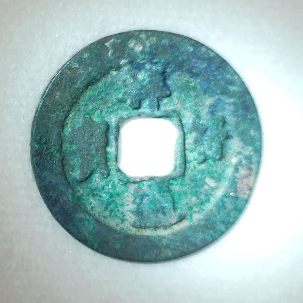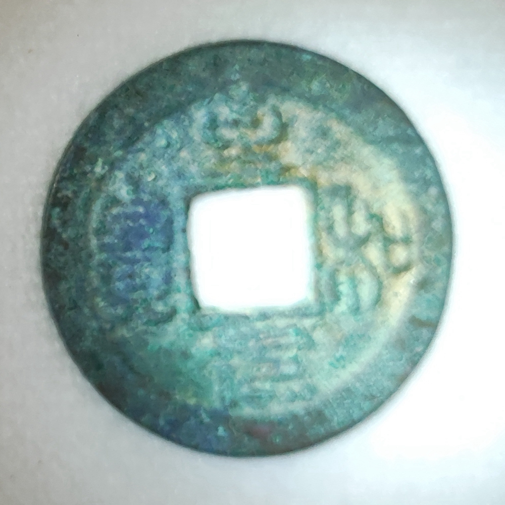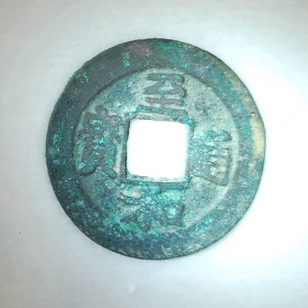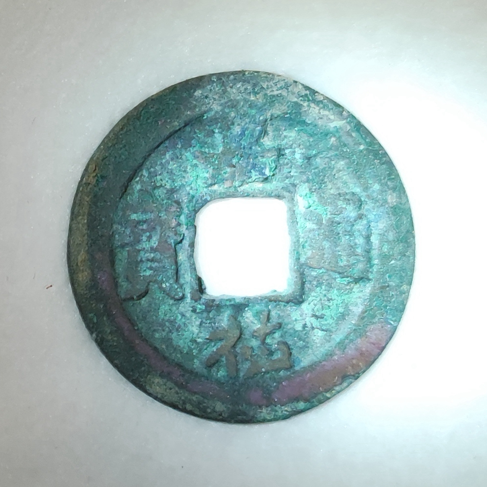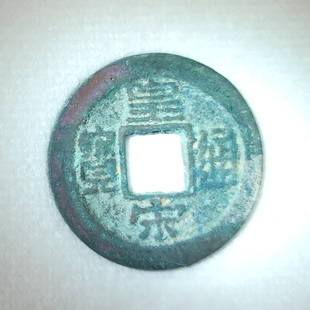 北宋,直径2.5厘米,重3.81克。 祥符通宝同样铸于宋真宗赵恒大中祥符年间(1008—101年),材质涵盖青铜、铁两种。 祥符通宝铜钱以小平钱为主,常见直径在2.3~2.5厘米,重量约3~5克。版式丰富,有大字、中…