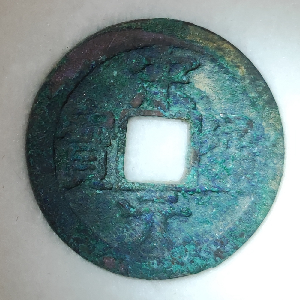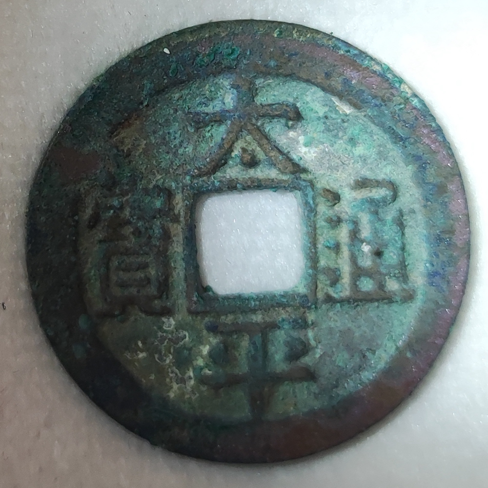 北宋,直径2.36厘米,重3.92克。 太平通宝钱铸于宋太宗赵光义太平兴国年间(976~984年),为北宋首个年号钱。有青铜、铁两种材质。太平通宝铜钱为小平钱,一般直径2.31~2.6厘米,重2.3~5.2克。面文“太…