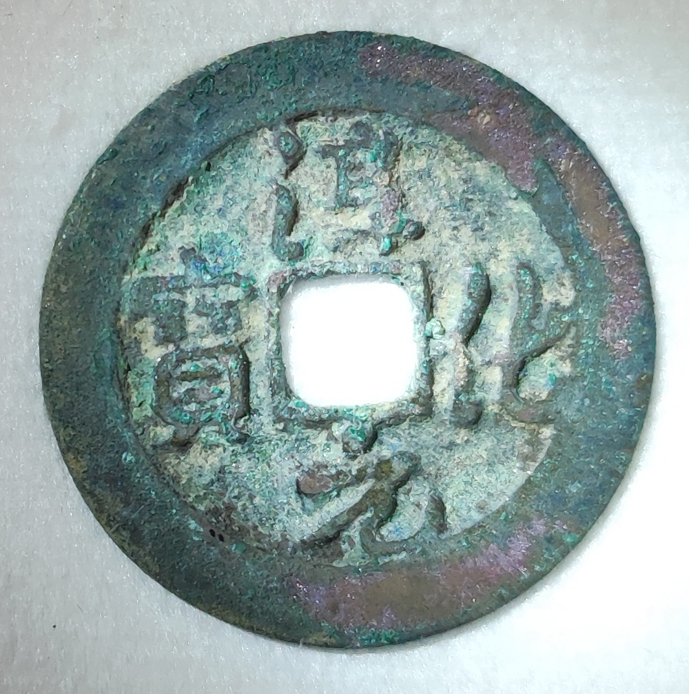 北宋,直径2.46厘米,重4.35克。 至道元宝钱铸于宋太宗赵光义至道年间(995~997年),青铜质。小平钱。一般直径2.43~2.52厘米,重3.4~4.8克。面文“至道元宝”,有楷、行、草三种书体,旋读。三种书体…
