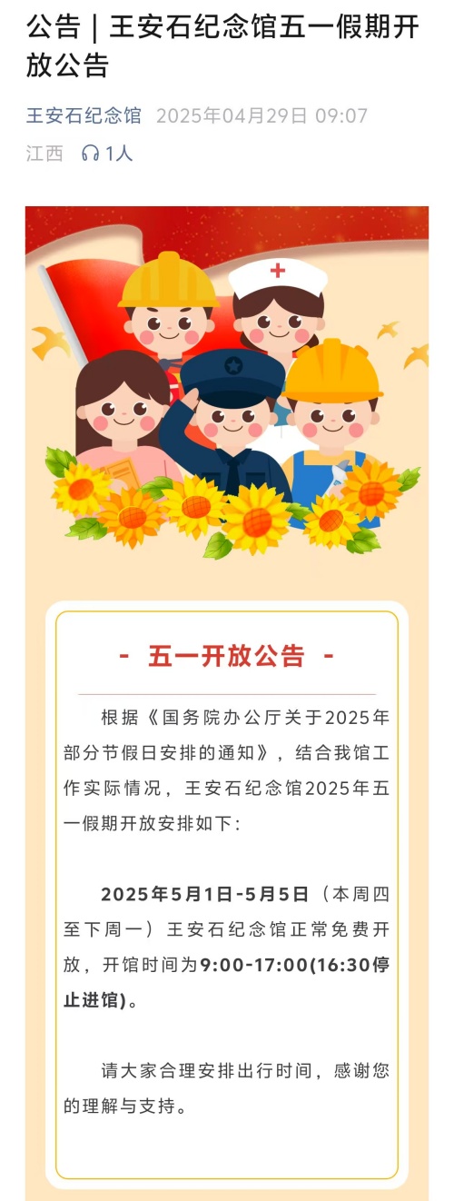 公告 | 王安石纪念馆五一假期开放公告