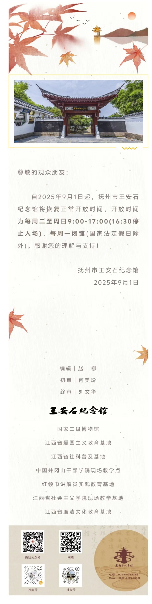 公告 | 抚州市王安石纪念馆9月1日起恢复正常开放时间