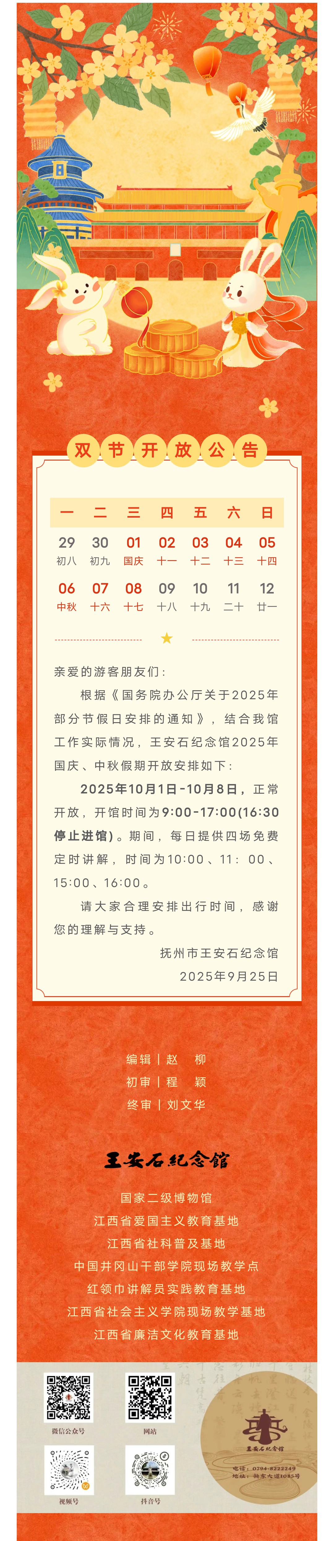 公告 | 王安石纪念馆国庆、中秋假期开放公告
